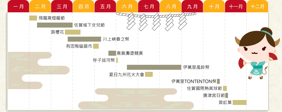 以佐賀城周邊為中心仍殘存著的城下町的城鎮風貌,佐賀城下女兒節就在這裡舉行,於佐賀市歷史民俗館、徵古館等地點展示女兒節人偶擺設。其中主要展示佐賀鍋島藩家承傳下來的女兒節人偶,手工精緻,人偶衣著也使用了佐賀鍋島小紋和手織佐賀錦等傳統工藝,十分華麗高貴。 活動日期:2月中旬~3月下旬
