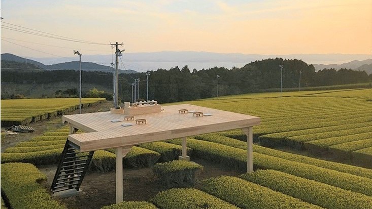 在一望無際的茶園中所設立的可以遠眺大村灣的絕景品茗空間。(池田農園2019年4月設立)