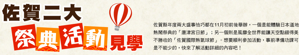 想要一睹100多顆彩色熱氣球同時升空的畫面嗎?那就一定要來佐賀縣才能看到這光景。佐賀縣擁有寬闊的平原穩定的天候 所以才能成為熱氣球玩家的天堂,號稱為世界級的佐賀國際熱氣球節,在每年秋天11月上旬前後在佐賀縣嘉瀨川旁熱鬧展開,這可是亞州最大、也是日本最大規模的熱氣球國際大會,聚集了國內外的熱氣球競技選手,滿天爭奇鬥豔的熱氣球,不但比技術,同時也比造型,每年平均吸引約百萬的觀光人潮前來參加。