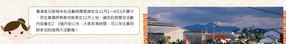 唐津宮日節活動的重頭戲是在11月2~4日,這3天所有的曳山會在唐津市內依不同路線進行遊行,分別有夜晚和白天遊行