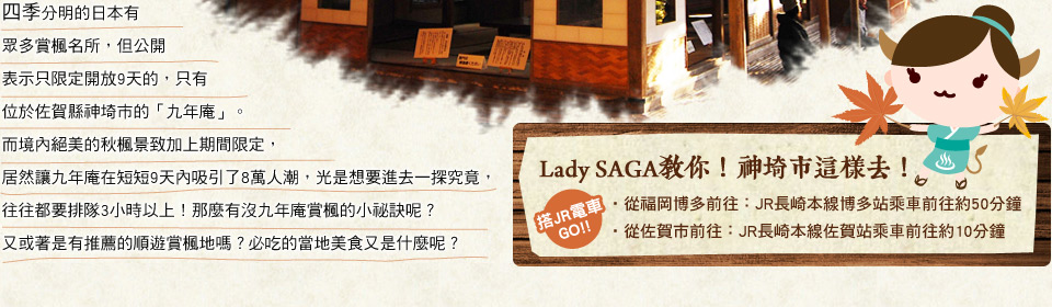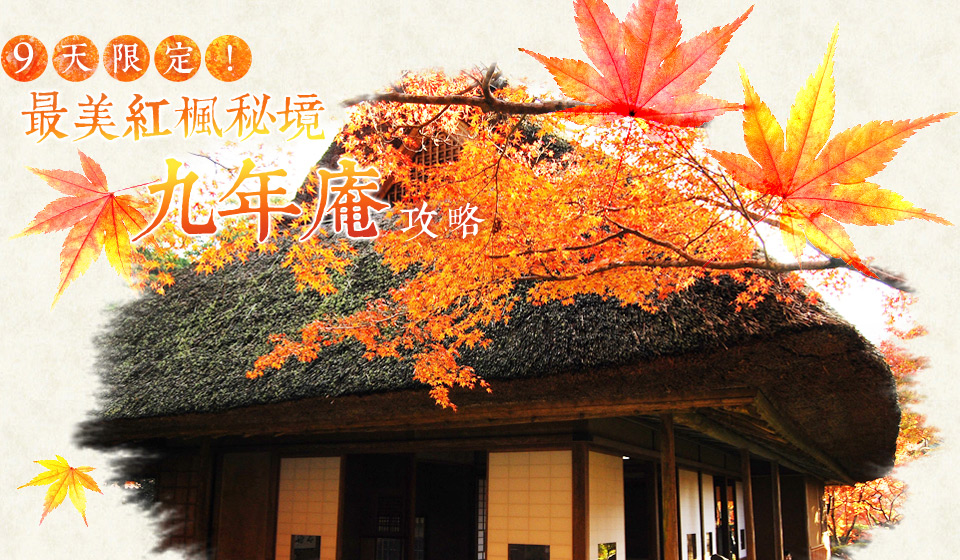 坐落於緩坡的九年庵,是明治時代的佐賀大企業家伊丹彌太郎耗費9年所蓋成的別墅庭園,腹地廣達2,057坪,並於1996年被指定為國家級的名勝景點。這裡每年僅於春季與秋季開放2次一般民眾入場,秋季的固定開放期間落在11/15~11/23,這段紅楓最美的時期每天平均有8,000人來場,可說是九州最熱門的賞楓名所知一。