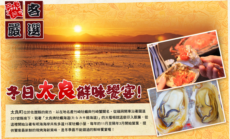 竹崎海產賣的海鮮種類相當多,價格也很透明化,平均每樣落在¥500~¥800不等。在店內用餐有蒸或烤兩種吃法可任選,冬季能夠嚐鮮的有竹崎牡蠣、竹崎蟹(母蟹)等海鮮,夏季則能品嚐竹崎蟹(公蟹),最為推薦的吃法為以燒烤方式料理鮮味。此外,其他如扇貝、海螺、明蝦等海鮮也都相當鮮甜美味,店內同時也提供限量銷售的螃蟹飯,非常值得一試。