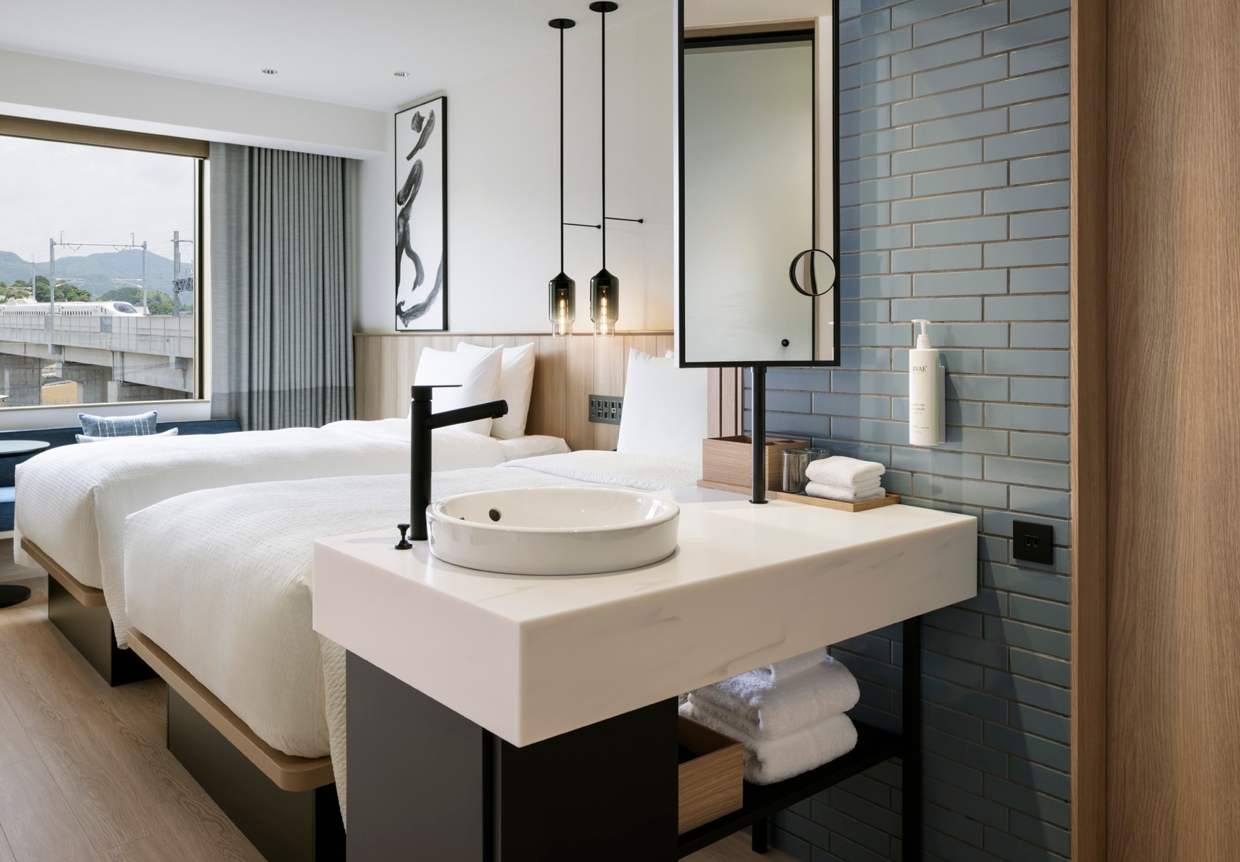 萬豪國際飯店集團首度進軍佐賀縣,從客房窗戶可看見嬉野茶園、欣賞西九州新幹線KAMOME列車進站身影。為了促進房客與在地互動,飯店不設餐廳,客房衛浴是淋浴間不設浴缸,希望旅客可多到溫泉街設施用餐與體驗泡湯。交誼廳非常時尚,備有咖啡機、微波爐、烤麵包機提供旅客使用。