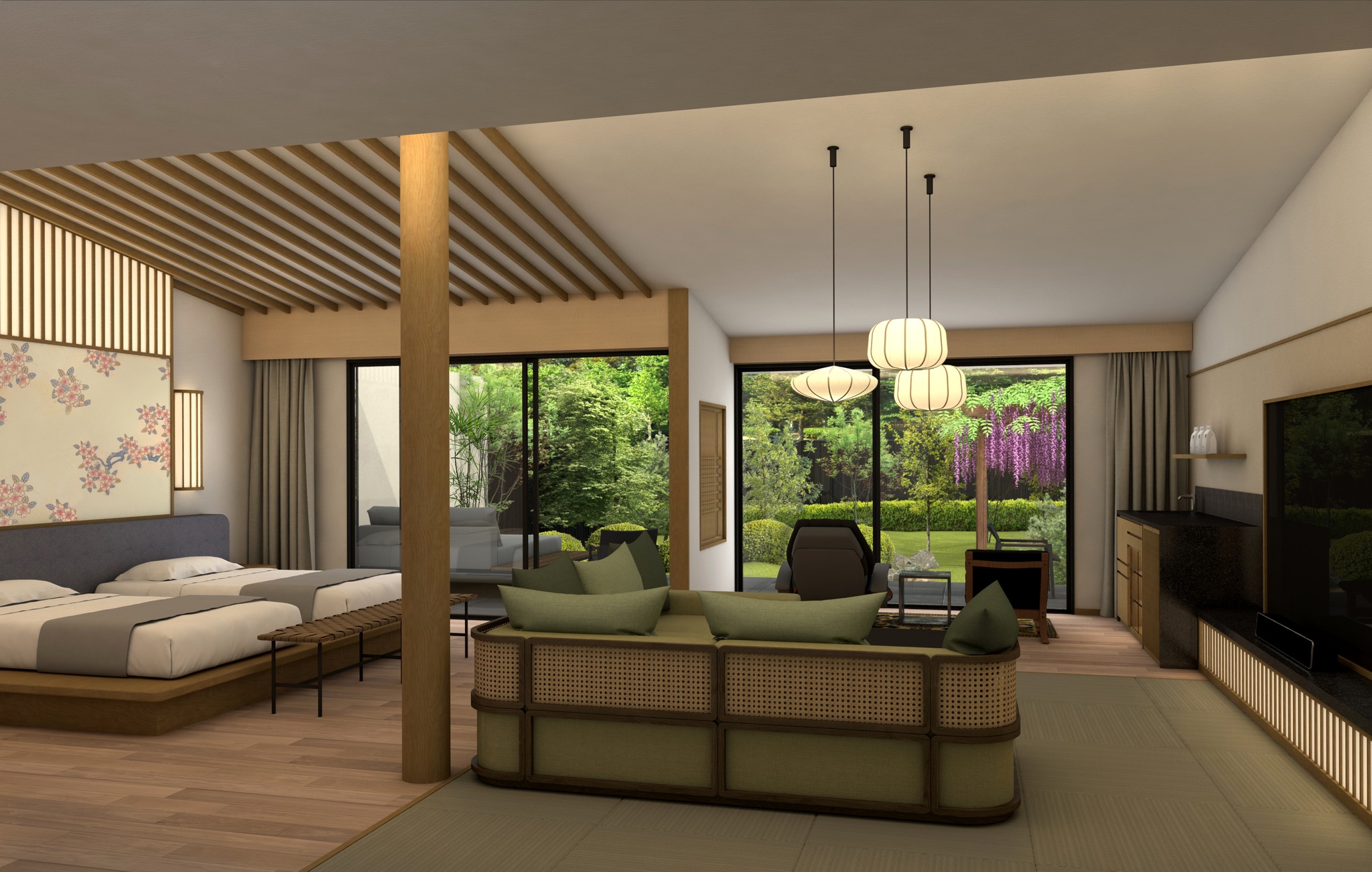整棟飯店以「茶」和「溫泉」作為設計主軸,每一間都設有源泉掛流式溫泉。完全是源泉湧出的天然溫泉。在茶會包廂中,來自嬉野町茶農家的北野秀一和田中宏,會將自家栽植的茶葉以煎茶、釜炒茶親自泡茶給住宿房客享用感受。