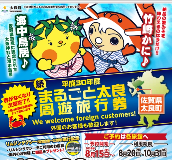 在佐賀南部靠海的地方有個太良町,以在地名產竹崎牡蠣和竹崎蟹聞名,還有「海中鳥居」也是最近熱門的觀光景點。今年10月底前有想要前往太良町觀光的朋...