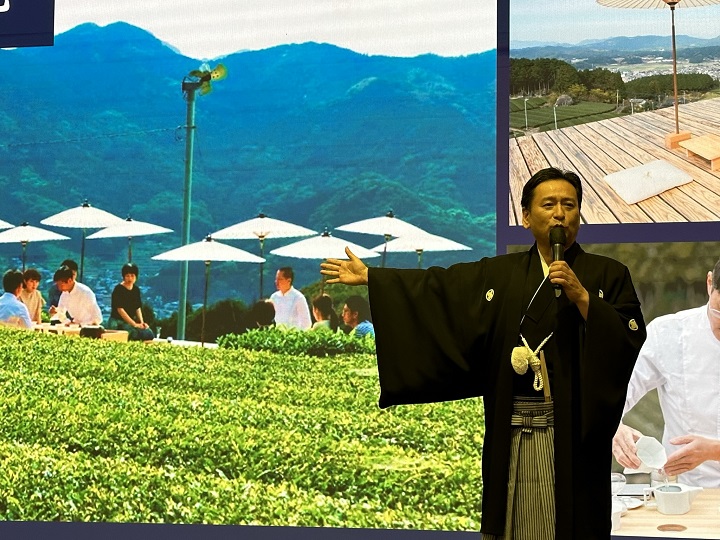 ▲佐賀縣長山口祥義介紹近年一席難求的優雅版嬉野茶席。 為了宣傳疫後新況、推廣觀光,日本佐賀縣長山口祥義親自領軍縣府團隊,昨天在台北舉辦盛大晚宴,邀請台灣觀光協...