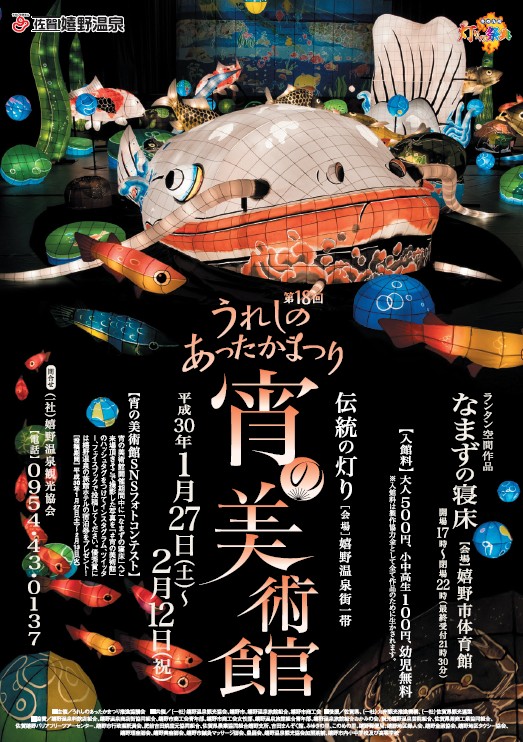 最能代表嬉野冬之風物詩的「嬉野暖呼呼祭」活動今年已邁入第18回,2018/1/27~2/12期間入夜後的嬉野溫泉鄉,可欣賞到各式美麗的燈籠作品,還可以半價享受滑溜溜的美肌溫泉,感受暖呼呼的嬉野冬夜!