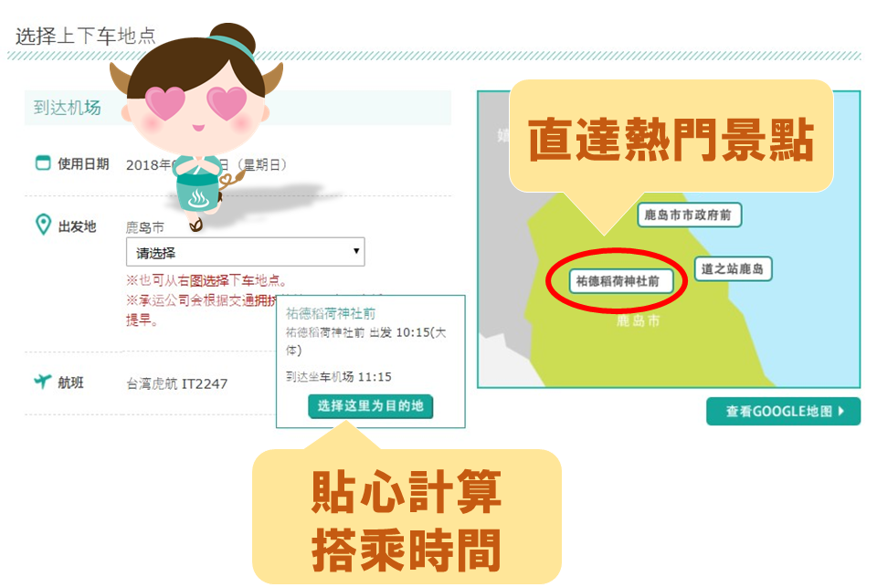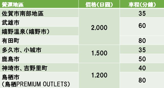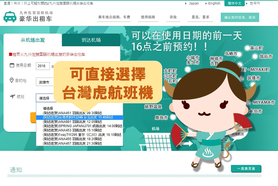 搭乘台灣虎航直飛航班抵達佐賀後,想快速又輕鬆地前往市區,利用一個人也能搭的「利木津計程車」超便利! 於搭乘前一天的下午4點以前,在網路上完成預約,單程每人只要1,200日圓起,自2018/4/1起新增前往太良町的路線,遍布佐賀縣內19個區域,不僅可直達武雄樓門、御船山樂園、嬉野溫泉、有田陶瓷之里購物商場、祐德稻荷神社等熱門景點,還享有一件大件行李箱免費,輕鬆展開佐賀之旅! 🚕 目前往返九州佐賀國際機場的巴士,由於班次時間並未與台灣虎航航班配合,因此需要在機場等待約2個小時才能搭乘,為了不浪費寶貴的度假時光,Lady SAGA為各位介紹超方便的利木津計程車(又稱共乘計程車)✨,官網提供中文頁面,只要3步驟就能輕鬆預約囉!