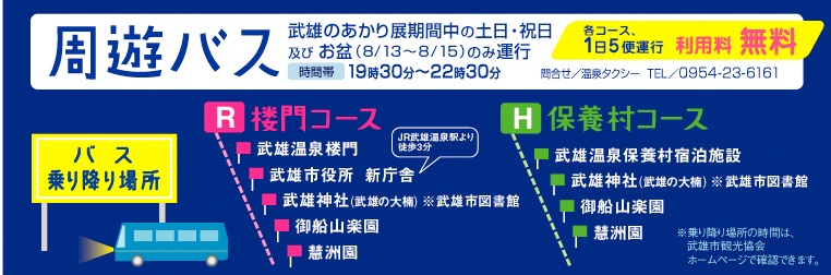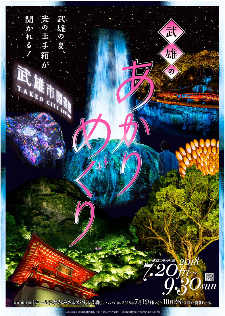 「武雄光之展」是從2015年慶祝武雄溫泉樓門建立100周年開始舉辦,今年已經是第四屆了,活動期間為7/20 (五)~9/30 (日),今年的活動會場包含了「御船山樂園」、日本庭園百選「惠洲園」、「武雄神社・武雄の大楠」、「武雄溫泉樓門」、「武雄市圖書館」、「佐賀縣立宇宙科學館」等地方,武雄光之展讓武雄市的夏夜變得十分熱鬧,歡迎大家來受不一樣的武雄市風情。活動期間的周末及例假日,市區內有提供免費的周遊巴士,也歡迎大家多加利用。