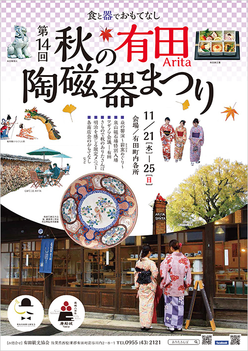 有田町為日本瓷器的發源地,至今已有400年的歷史,有田每年春天5月黃金周時都會舉辦盛大的「有田陶器市」活動,會吸引約100萬人前來造訪,許多陶瓷器迷都會特地前來為家中的餐具增添新成員,到了秋天還有另一場陶瓷器盛會,今年舉辦第14回,活動期間為11月21~25日,秋天的活動為了紀念明治維新150週年,以「明治有田偉人博覽會」為主題的「秋の有田陶瓷器祭」。
