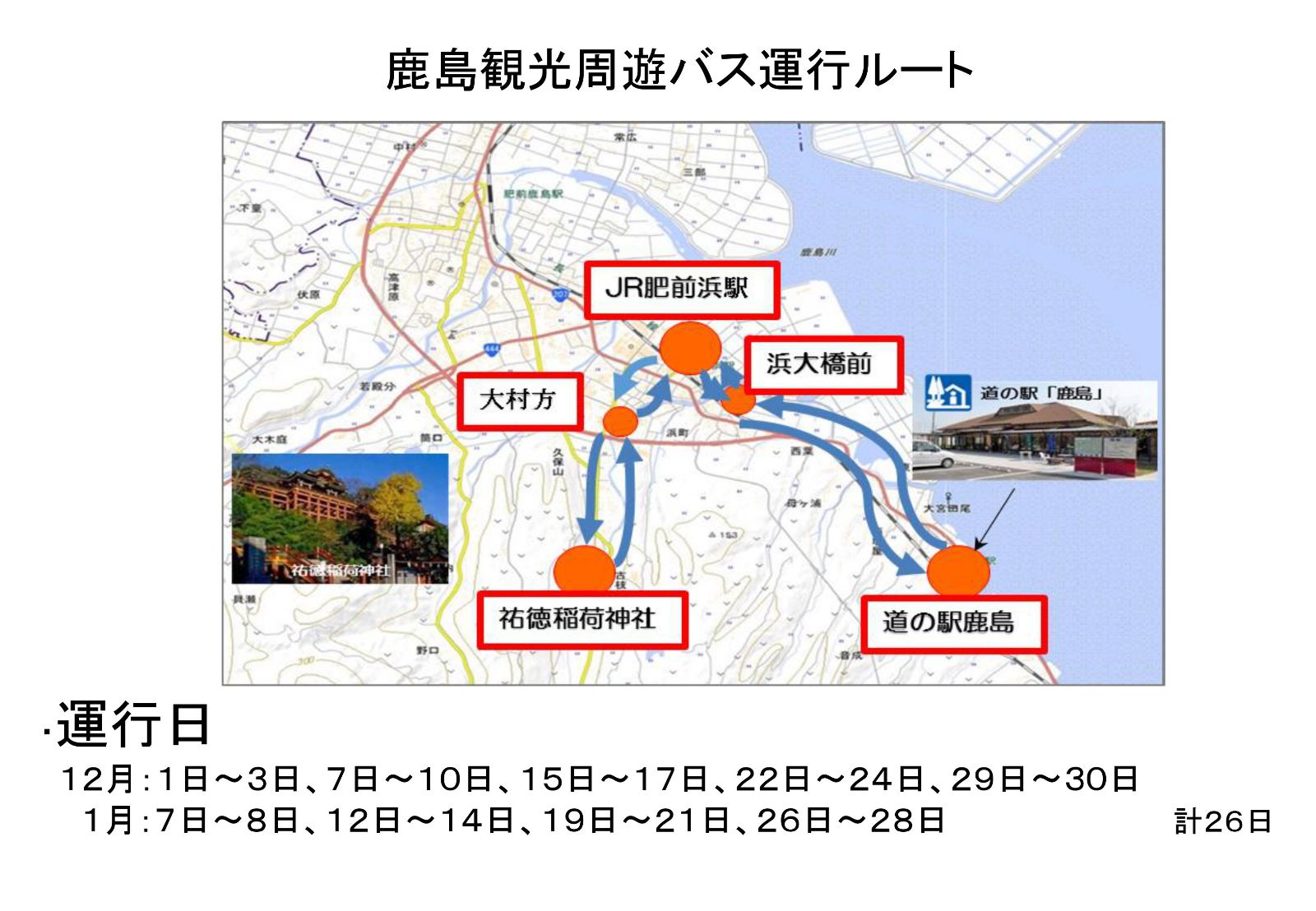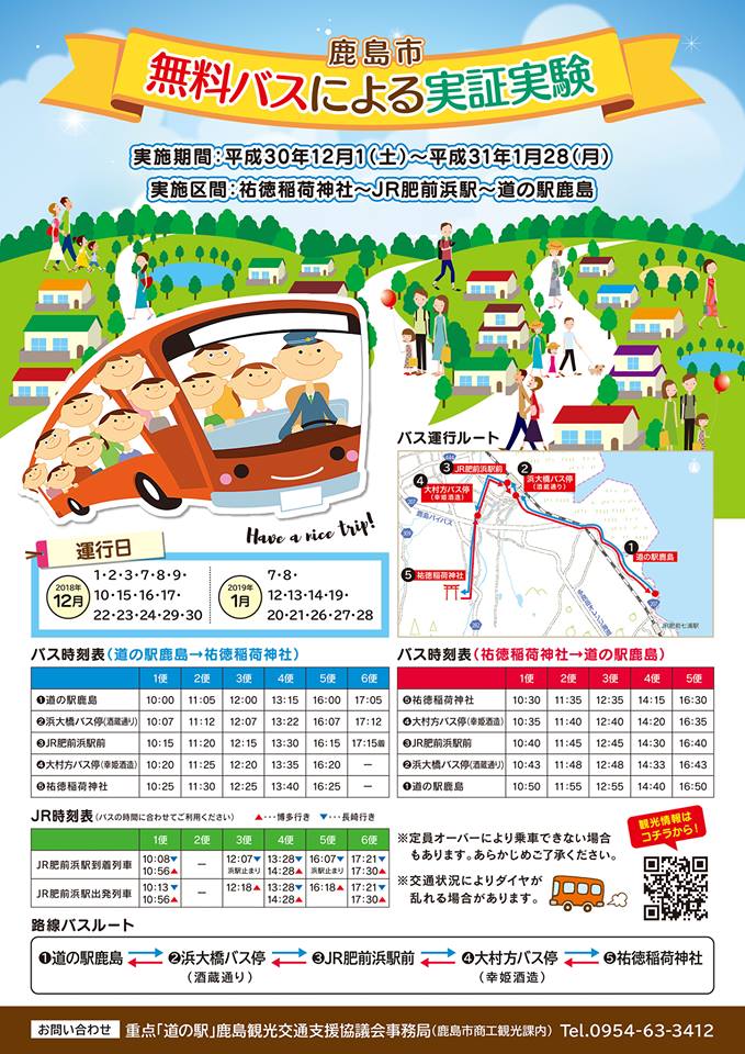 佐賀縣鹿島市有許多知名的觀光景點,像是祐德稻荷神社、肥前濱宿及鹿島休息站(道の駅鹿島),平常自行坐巴士前往這些地方下車後,都還需要徒步一些時間後才能到達景點,為了方便遊客在這些景點之間移動,冬季期間2018/12/1~2019/1/28的特定日子推出免費觀光周遊巴士,讓大家可以更輕鬆地抵達鹿島市的觀光景點,歡迎多加利用免費觀光巡遊巴士。