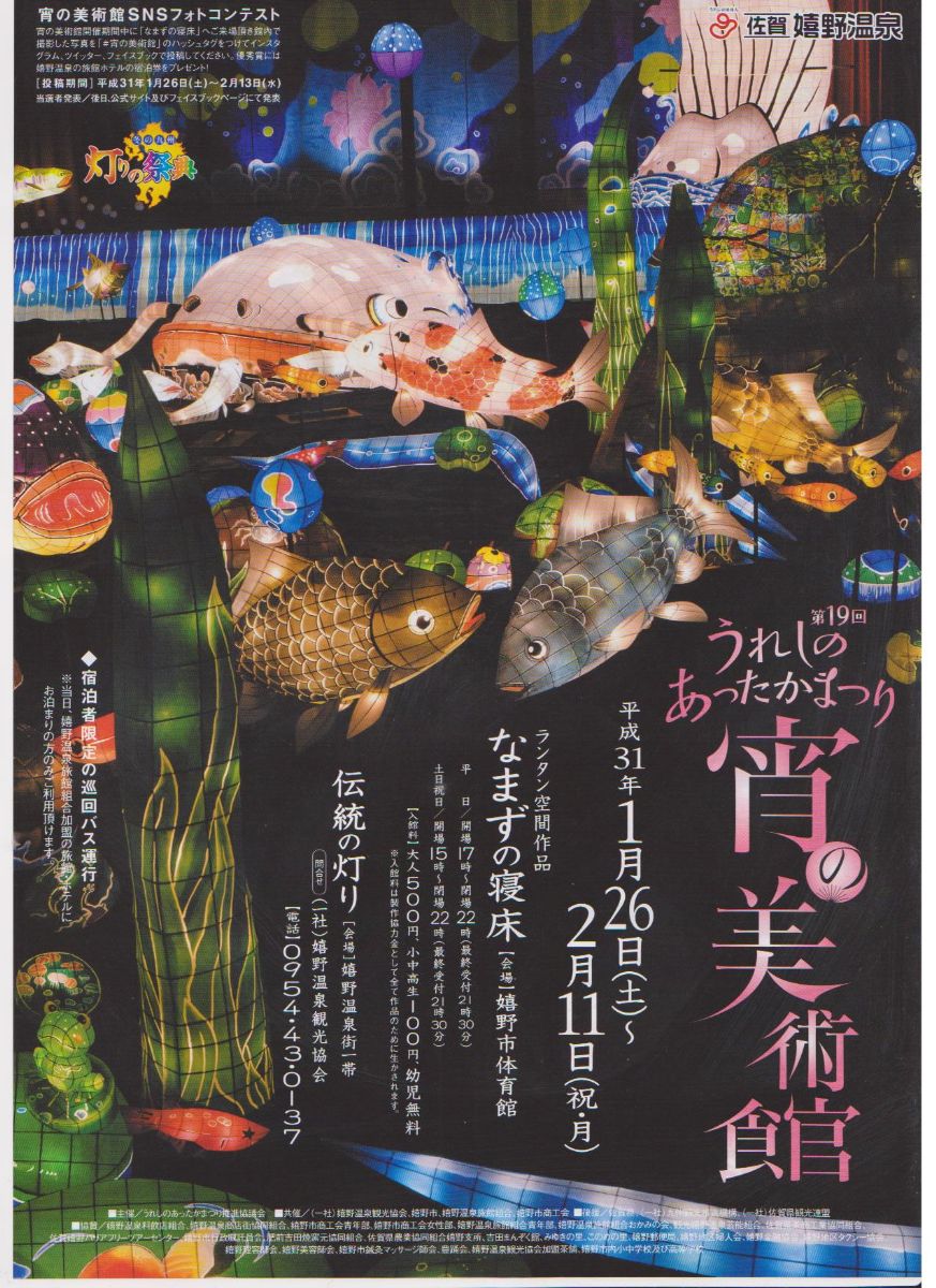 自從兩年前開始擴大規模多了「宵の美術館」,讓整個活動內容變得更豐富。結合嬉野溫泉豐玉姬神社傳說,由燈籠藝術家三上真輝和500位嬉野市民協助製作的巨大燈籠「鯰魚的寢床」作品,以美肌之神白色大鯰魚為主,今年更有多達220座燈籠,主會場於嬉野市體育館展出。