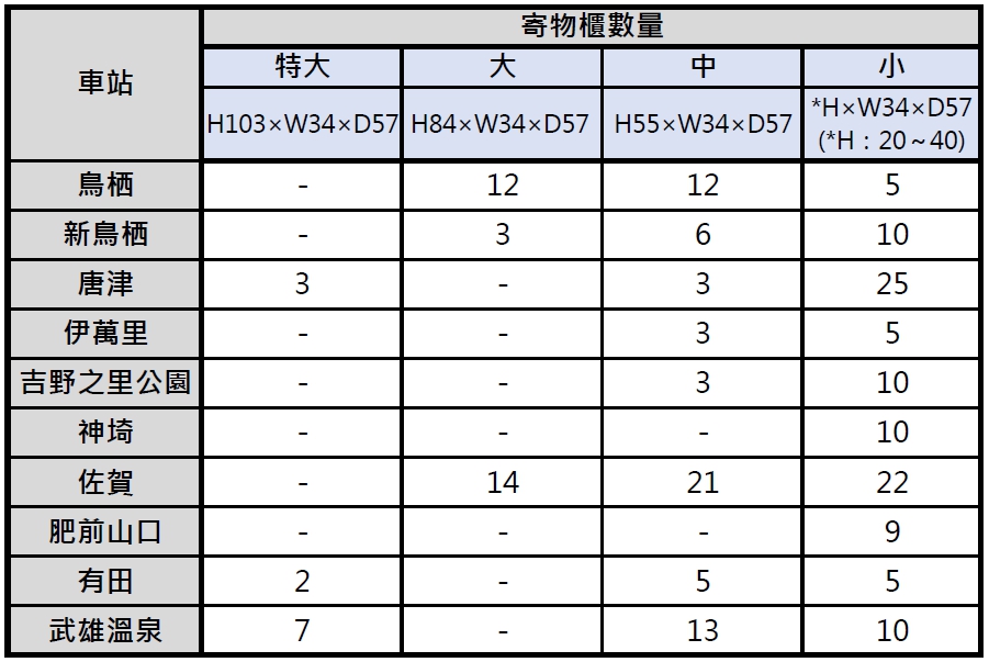 ▼佐賀縣內各車站置物櫃數量列表▼(寄物櫃費用:300~900日圓)