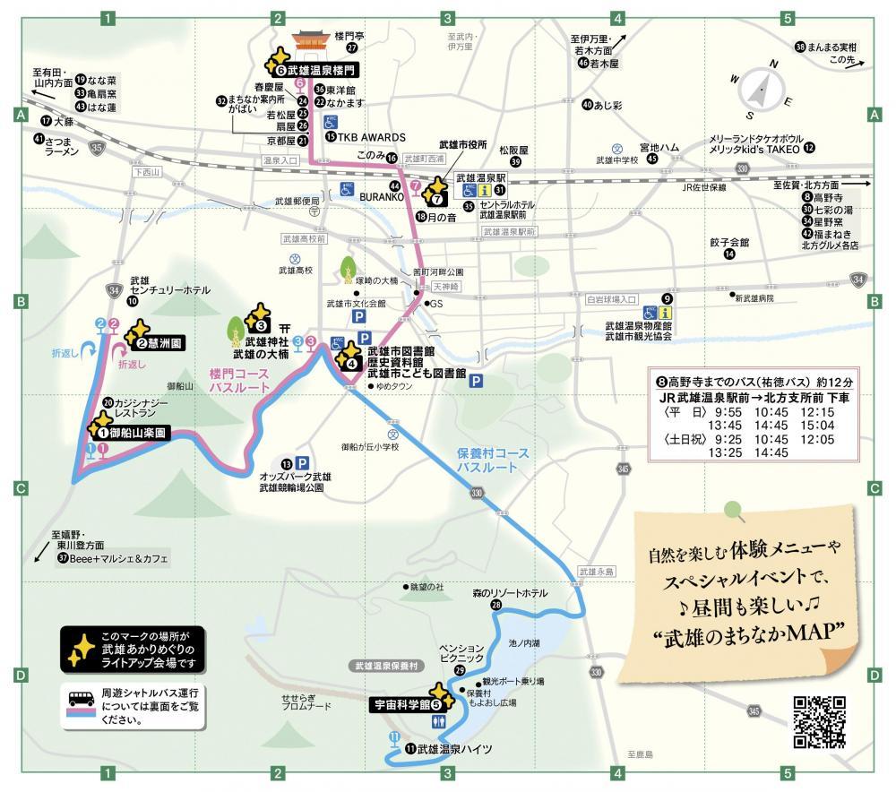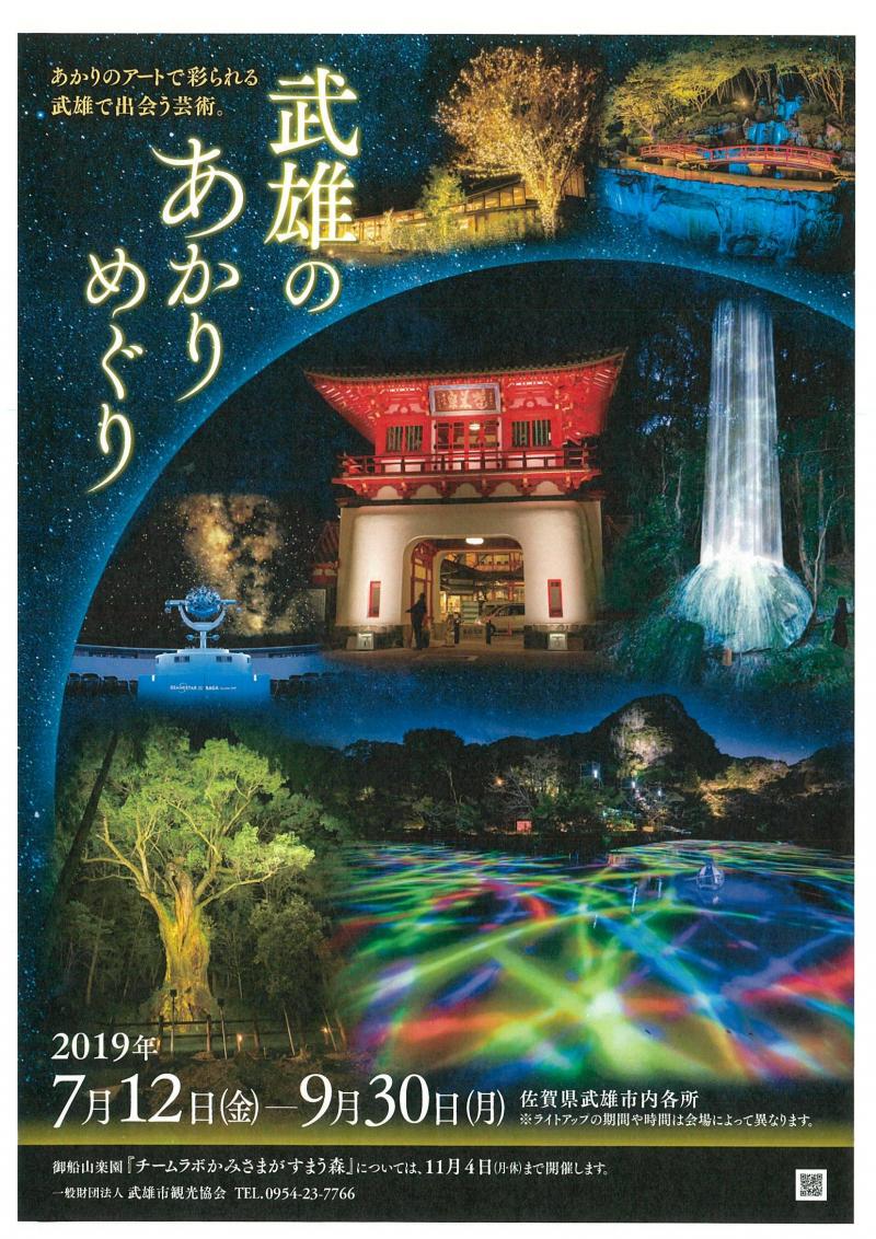 「武雄光之展」是從2015年慶祝武雄溫泉樓門建立100周年開始舉辦,今年已經是第五屆了,活動期間為7/12(五)~9/30 (一),主要活動會場包含了國家指定名勝地「御船山樂園」、日本庭園百選「惠洲園」、「武雄神社・武雄の大楠」、「武雄溫泉樓門」、「武雄市圖書館」、「佐賀縣立宇宙科學館」等地方,武雄光之展讓武雄市的夏夜變得十分熱鬧,歡迎大家來受不一樣的武雄市風情。活動期間的週六、週日及例假日,市區內有提供免費的周遊巴士,也歡迎大家多加利用。