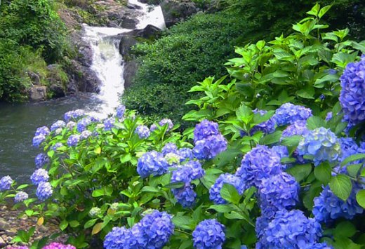 沿著瀑布一帶約有40種類、多達40,000朵的紫陽花,盛開之時一片粉紫粉藍相間的景色襯托著著名瀑布,風景美麗得讓你忘卻炎熱的天氣!瀑布四周有公園、吊橋,遊客可從不同角度欣賞瀑布美景。