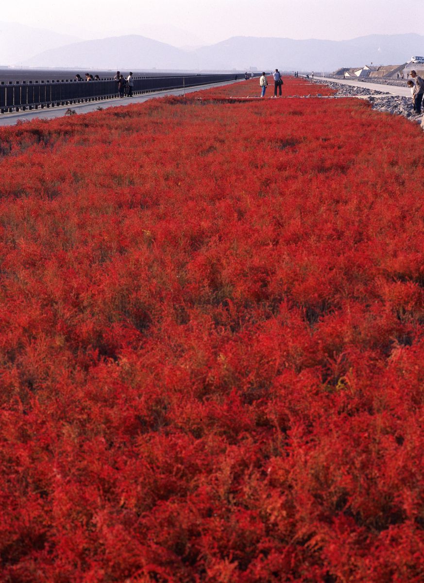 秋季在佐賀的東與賀海岸還能看到與眾不同的海上紅葉,是被稱為七面草的鹽生植物,11月起便會從綠色變成深紅色,高約20~40公分的大片草皮看起來就像是深紅色海洋般,獨特景象十分壯觀。