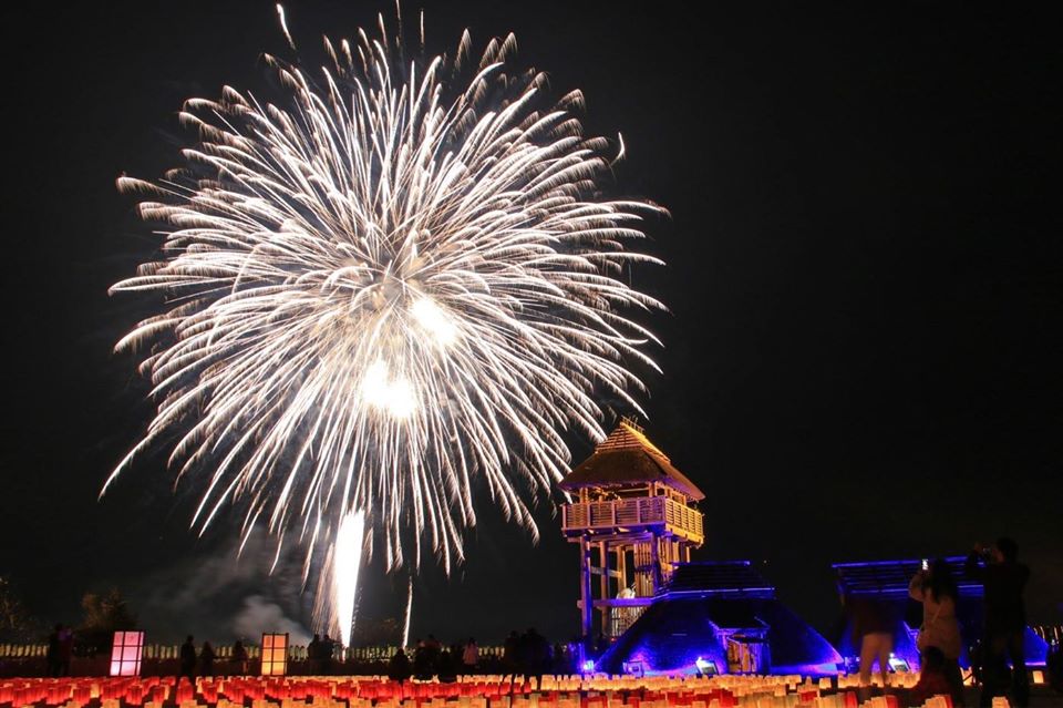 以光與火交織成美麗景象的「吉野里 光之響」活動,最大特色就是使用上千支蠟燭排出巨大圖案,19:30~20:00還有熱氣球夜間停留,最後施放美麗的大型煙火為冬夜劃下完美句點。