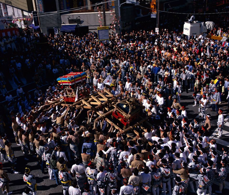 ▲活動期間,神輿及團車會在市區內巡視繞境並舉行合戰,氣氛熱鬧非凡。