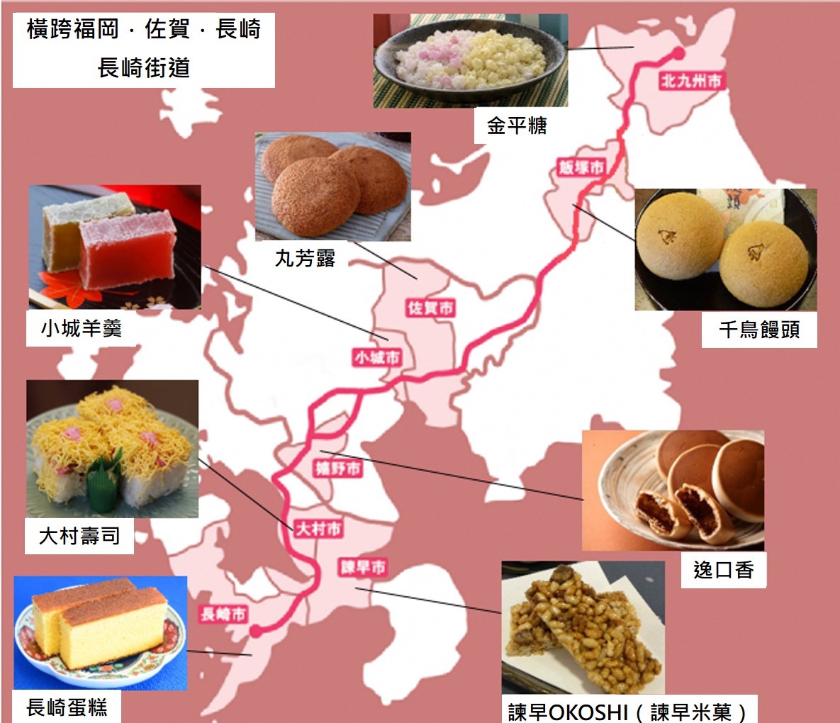 橫跨福岡.佐賀.長崎的長崎街道又被稱為「砂糖之路」,約228公里長,已有400多年歷史,顧名思義是過去運送砂糖的重要道路,在江戶時期的鎖國政策下,從海外被運送至日本的砂糖、會統一在唯一的貿易窗口長崎縣出島卸貨,經由佐賀縣(嬉野市、小城市、佐賀市),再到福岡縣的小倉,一路運送至京都、東京等大城市。同時西洋人也帶來了本地的甜點文化,因為這樣的契機,長崎街道沿街的城市誕生出許多和洋融合的甜點,和一般和果子可是大大不同喔!