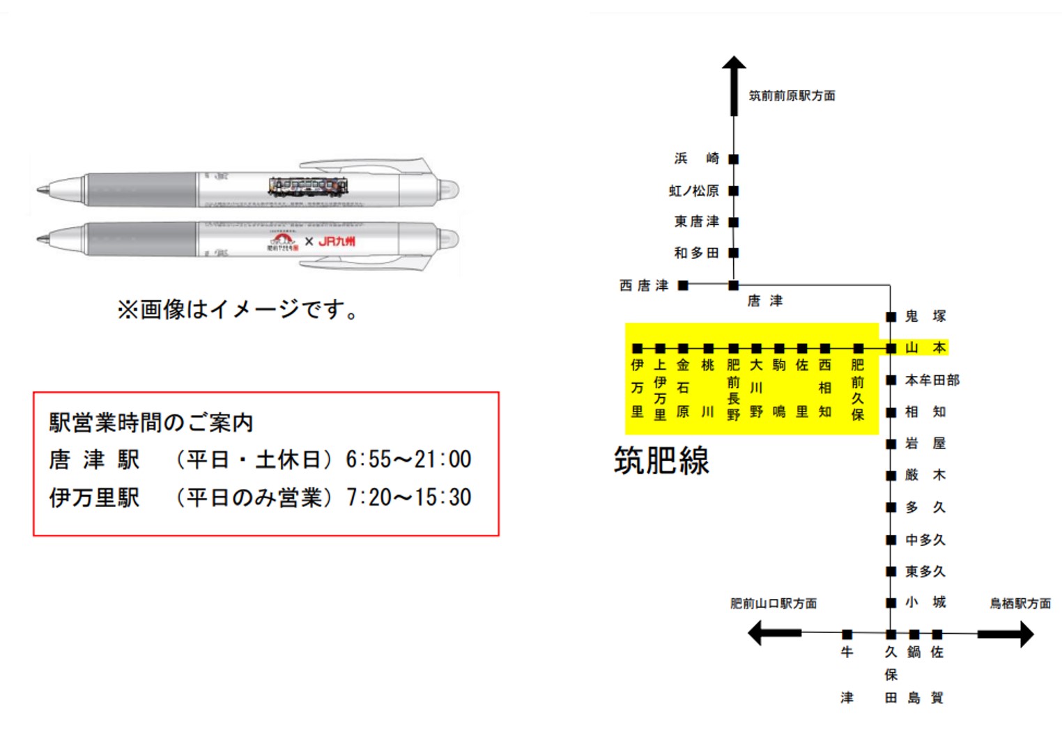 配合列車啟航,JR九州也推出LINE線上集章活動,於唐津站、伊萬里站設置專屬QR code,只要集章完成,便可至兩地車站內的觀光協會,兌換唐津城主家紋手巾&唐津市吉祥物「唐汪君(唐ワンくん)」明信片組、伊萬里鍋島燒花紋紙膠帶,數量有限送完為止!另外,前300位在唐津站、伊萬里站出示JR筑肥線(山本站-伊萬里站)全段區間車票者,還可獲得彩繪列車圖案的原創原子筆喔!