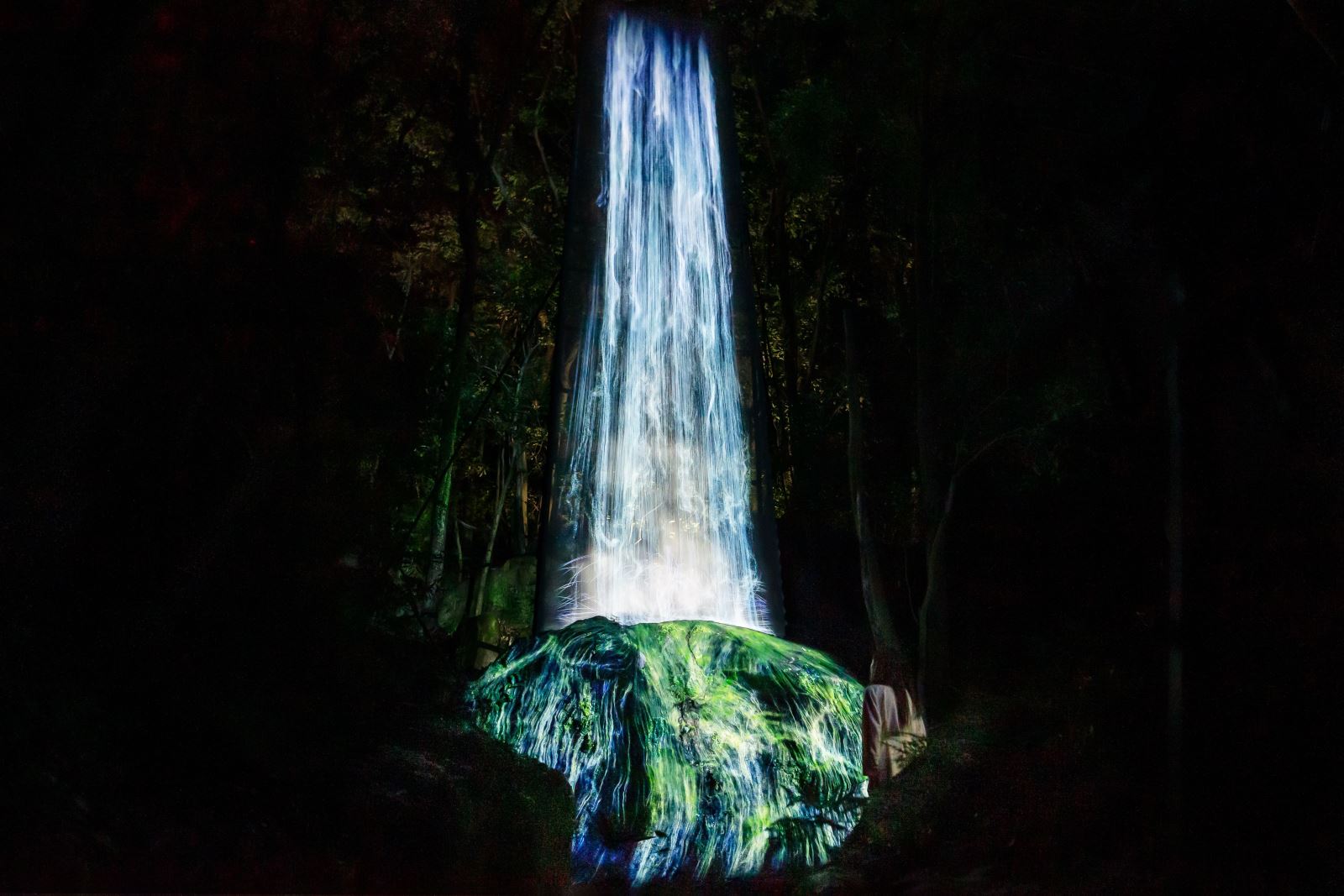 ▲「在神明所居住的岩石上呈現水粒子世界」打造出從天而降的虛擬巨瀑。