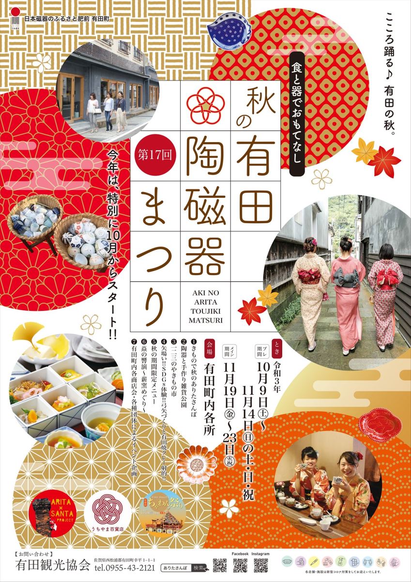 「2021秋季有田陶器市」即將於11月19日盛大展開,今年特別在10月率先暖身,10月9日~11月14日每逢周末、國定假日都有精彩活動,眾多市集攤位可以逛好逛滿不用說,也能穿著和服漫遊有田町、探索紅葉秘境、品嘗期間限定的在地料理、搭乘平日僅供包車使用的觀光小火車遊佐賀鄉野,還有以素陶為靶的射箭體驗、「幸樂窯」瓷器挖寶、白陶燈DIY、有田燒飾品DIY等親子同樂體驗。