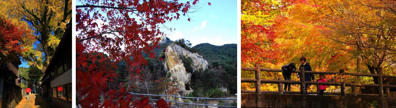 ▲(左起)泉山弁財天的大公孫樹、泉山磁石場、龍門峽。