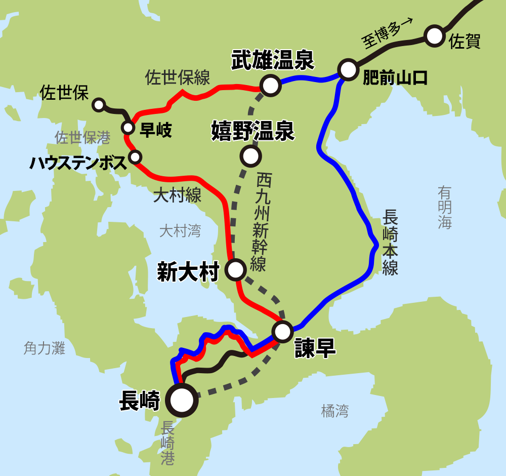 【藍線.上午發車】「武雄溫泉」出發,經由「長崎本線」至「長崎」