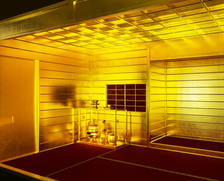 這間可移動組裝的黃金茶室復刻版,參考與豐臣秀吉關係親近的博多商人神屋宗湛所撰寫的茶會記「宗湛日記」復原重現。茶室空間約3張榻榻米大,職人們使用16,500片邊長11公分的正方形金箔,讓壁面、天花板、茶具(茶筅、茶巾除外)等全都包裹著黃金,可拆解成75個零件,製作費耗資3,600萬日圓。
