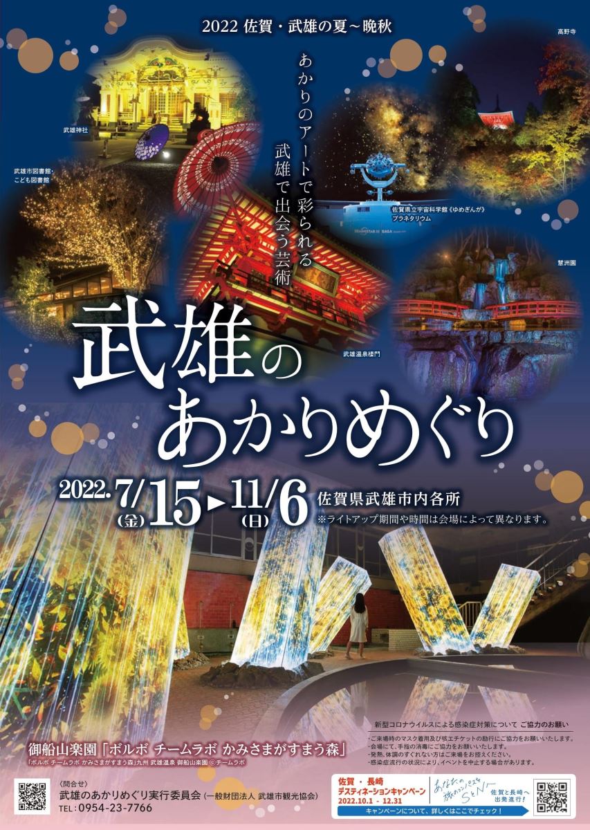 7月15日至11月6日期間,以御船山樂園為首,武雄溫泉樓門、武雄神社、武雄市圖書館.武雄市兒童圖書館、佐賀縣立宇宙科學館、武雄市公所、高野寺,以及睽違3年回歸的慧洲園,共計市內8大名所會陸續透過燈光藝術,帶給旅人滿滿的視覺震撼,讓武雄從夏天一路耀眼至晚秋。快來瞧瞧今年有哪些亮點!