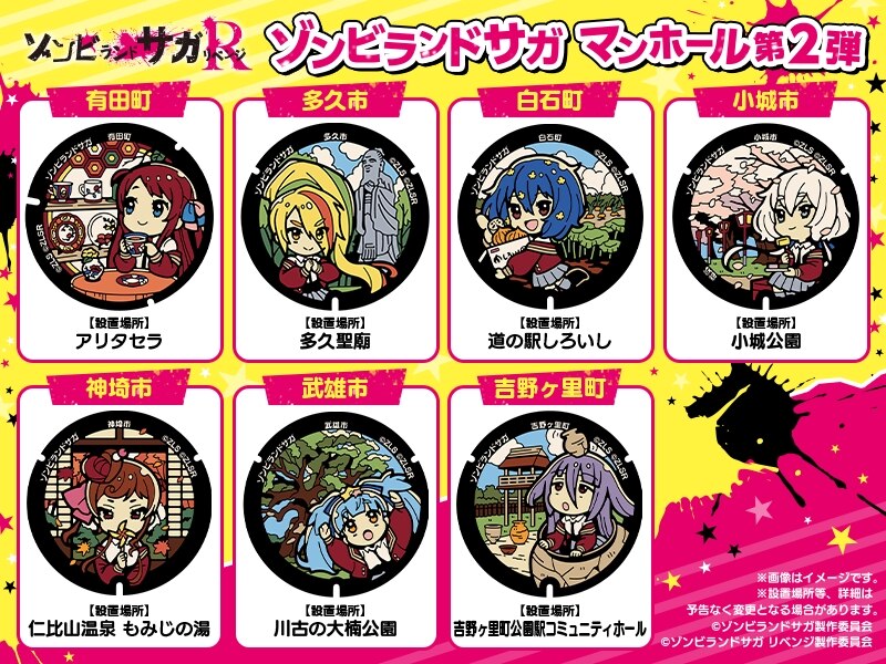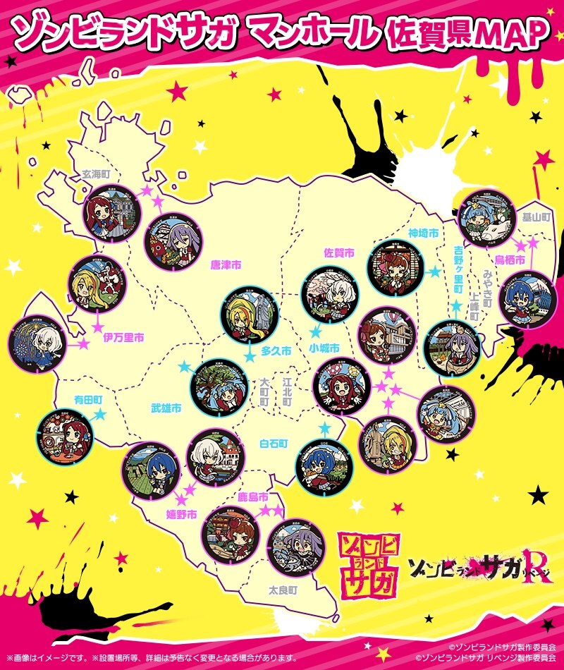 以佐賀縣為舞台,變成殭屍的7名少女作為偶像團體「法蘭秀秀」活躍其中的超人氣原創電視動畫「佐賀偶像是傳奇」播出以來備受矚目,曾被票選為「動畫總選舉2018年大賞」第一名。為紀念續集「佐賀偶像是傳奇捲土重來」在電視、網路上播放,2021年4月在成為聖地的佐賀縣6市共設置了14款「佐賀偶像是傳奇人孔蓋」,這回為了策畫在尚未設置的14個市町展開活動,啟動佐賀縣全部20個市町的設置計畫,今後將於縣內所有市町裝設「佐賀偶像是傳奇人孔蓋」。