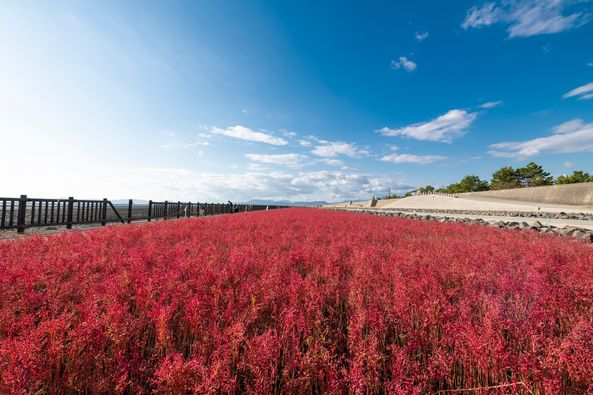 佐賀市郊的東與賀海岸,平時能一探有明海驚人的潮汐變化,秋季還能看與眾不同的海上紅葉。被稱為七面草的鹽生植物,10月下旬起會逐漸轉為紫紅色,沿著海岸線綿延約1.6公里長,遠看就像深紅色海洋般。而往年也會舉辦夜間點燈活動,配上海平面的落日餘暉,更是美上加美。