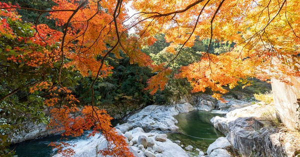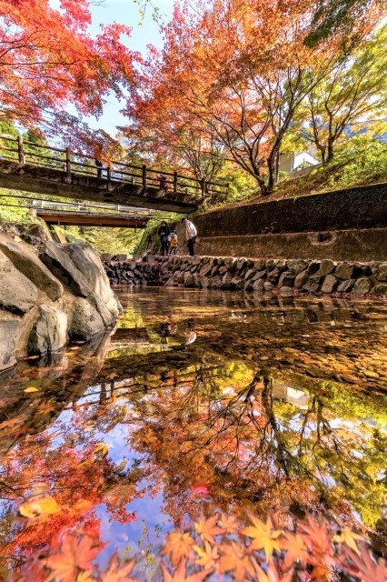 古湯溫泉及熊之川溫泉間的賞楓秘境「雄淵雌淵公園」,以溪流中連綿不斷的奇岩怪石為吸睛亮點,由於此處急流洶湧,也曾是明治時代從北山搬運木材的木筏行經時最困難的路段。從跨越河川上的鳴瀨橋眺望,楓紅景致搭配急流奇岩,猶如一幅絕美畫卷。