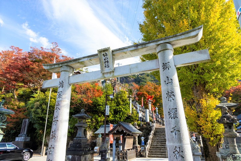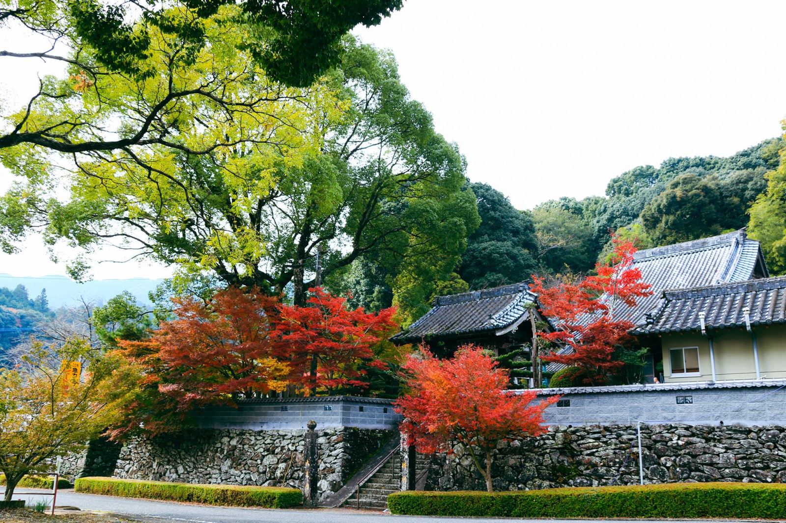 九年庵旁的千年神社「仁比山神社」,祭祀著農業之神、山神。境內擁有眾多古老楓樹,秋季時會將參道染得一片通紅,經典的鳥居映紅楓景致,可是擄獲不少追楓旅人的心呢!