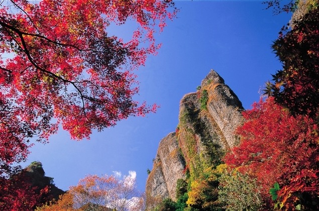 九州百大名山之一.黑髮山上的乳待坊公園為當地首屈一指的展望公園,也是備受喜愛的賞楓熱點。從展望台可把山頂的天童岩和夫婦岩一覽無遺,奇岩怪石有如水墨畫的美景也讓此地成為修行者的據點,催生出不少修行者的精舍道場。從停車場走到黑髮山頂攻頂約45分鐘。從展望台走到夫婦岩約10分鐘。