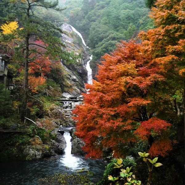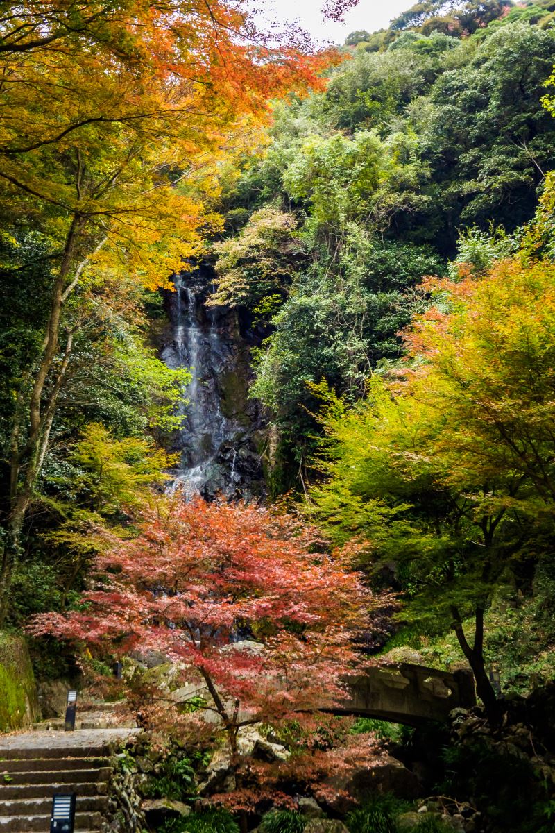 觀音瀑布為日本百大瀑布之一,落差45公尺的飛瀑力量感十足,又被稱為「男瀑」,是在地人才知道的賞楓名所。