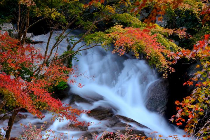 見返瀑布是九州最大高低落差達100公尺的瀑布,以繡球花勝地聞名,秋天賞楓也毫不遜色。11月中旬過後,瀑布周圍的楓樹漸漸轉紅,在絢麗紅楓的相襯下,氣勢磅礡的見返瀑布顯得更加壯麗。