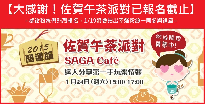 另外,即將在1/24(六)舉辦的「2015開運版!佐賀午茶派對SAGA Café」已正式報名截止!非常感謝各位粉絲的熱情報名,期待有機會與您1/24相見♪