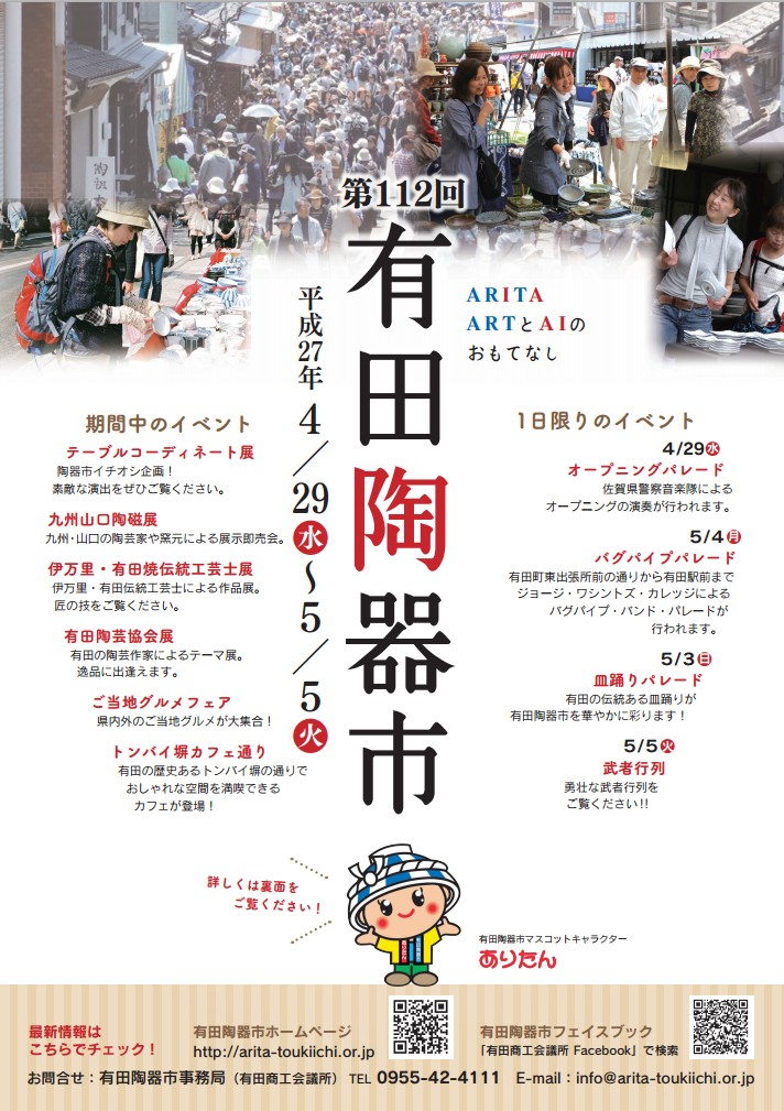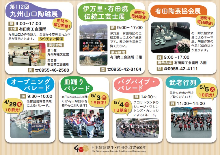 當然,令陶瓷迷瘋狂的陶器、瓷器展覽也相當豐富。除了展出佐賀當地的有田燒與伊萬里燒外,還有來自日本全國的各地的陶瓷作品。另外,在4/29、5/3、5/4、5/5還有各種遊行活動,相當熱鬧值得一看喔!