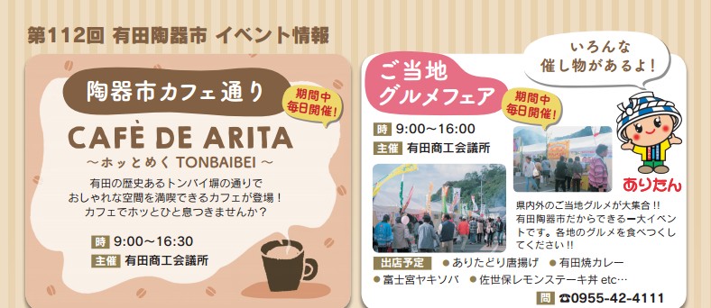 此外,今年更推出美食展覽並在「裏街道之TONBAI塀」打造「陶器市café大道」,祭典期間內每天OPEN!挖寶累了想休息一會,能夠選擇來到超有氛圍的咖啡店內小憩。而在美食展中,販賣有田燒咖哩、富士宮炒麵以及佐世保檸檬牛排等料理的攤販也都齊聚一堂,提供旅客各地的當地美食!