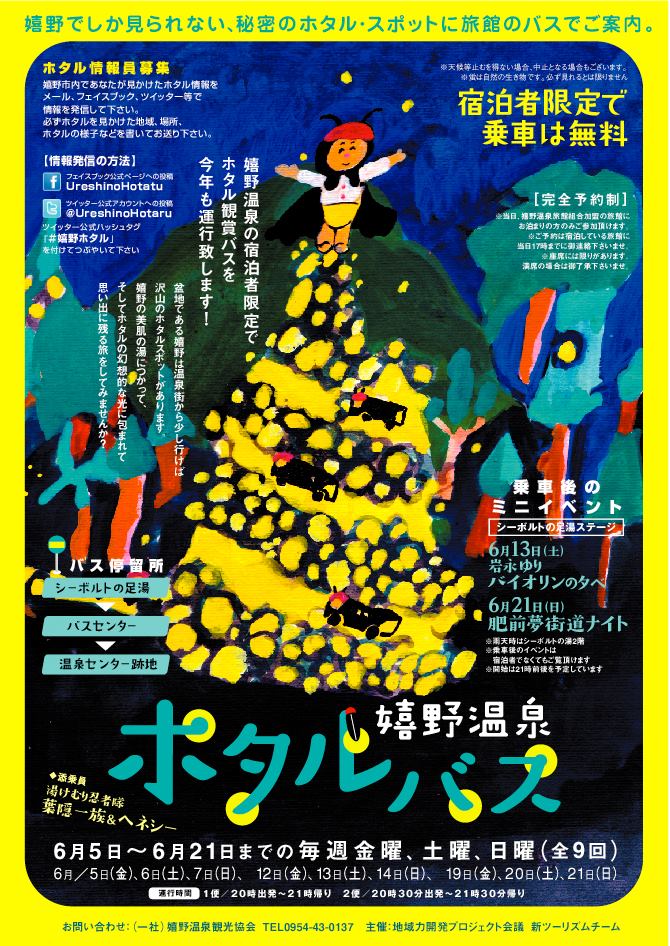 今年的賞螢巴士在6/5~6/21期間將會運行9 次,活動期間內只要是入住於「嬉野温泉旅館組合」旗下旅館的旅客都能夠免費搭乘,僅需事先預約即可相當方便呢!