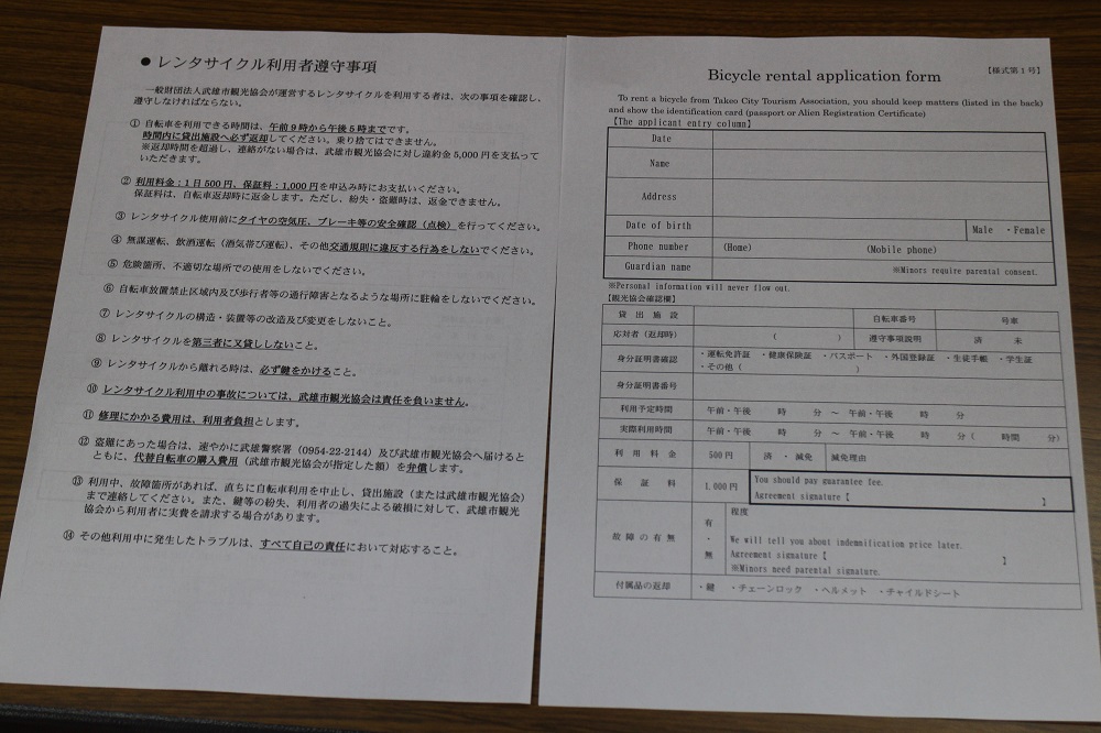 好消息!讓大家有久等了,武雄市也開放租借腳踏車的服務了,在武雄市內共有4個地方可以租借到腳踏車,共有20台,需要在同一地點租車及還車,租借時間從上午9點到下午5點,一次費用1000日圓,另外需付1000日圓押金,相當划算又便利,而且都是電動腳踏車,騎起來非常的省力,連陡峭的斜坡都可以輕鬆騎上去。