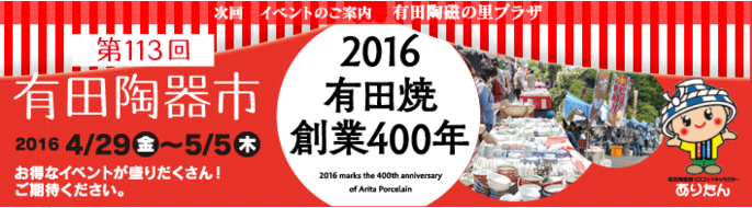 每年有田燒陶器迷最期待的「有田陶器市」今年將舉辦第113回,活動期間一樣在4月29日~5月5日,這段期間正好是日本的黃金周假期,而且加上今年剛好也是有田燒誕生400週年,許多店家也推出了400週年紀念商品,想必湧入的人潮會比平常更多,此時總會聚集許多陶瓷迷來這裡撿便宜、挖寶,平時寂靜的有田地區會變得也格外的熱鬧。