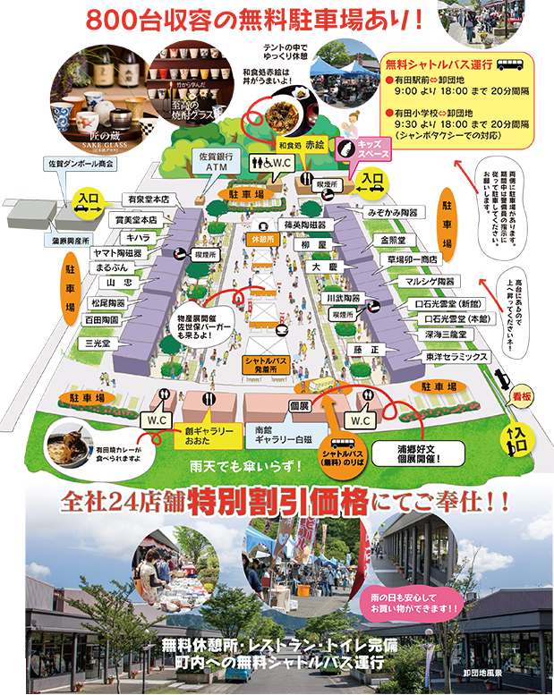 另外,如果覺得有田市區人太多、東西太多不知道該怎麼下手的人,建議也可以直接到「有田燒卸團地-有田陶瓷之里PLAZA」,這裡算是世界最大型的有田燒購物商場,有24間大型店鋪、餐廳以及免費的休息區,「有田陶器市」期間從上午9點開始有免費接駁巴士從有田車站,每隔15分鐘一班,大家快來盡情挑選購買吧!