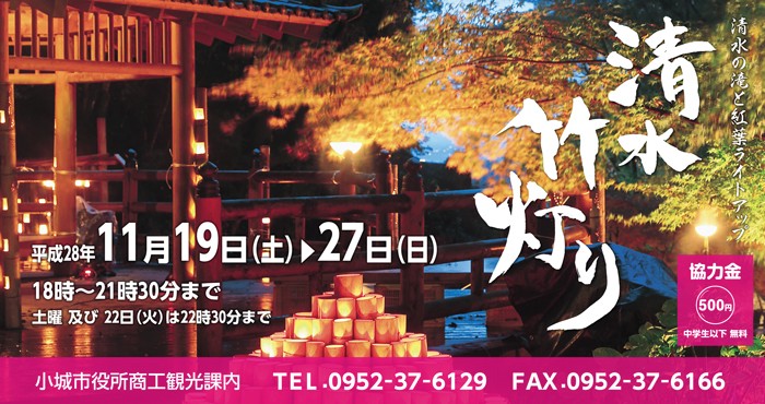 距離佐賀市區不遠的小城市,搭普通電車約15分鐘就可抵達,本來每年都固定在11月15~23日舉辦的「清水竹燈」活動,今年改到11月19~27日。「清水竹燈」的地點位於清水川上游的清水瀑布,高低落差有75公尺,這裡也曾被選為「日本名水百選」。活動期間將會沿著散策步道擺放了約千盞的竹燈籠,將活動會場點綴得美輪美奐,在夜晚呈現出幻想世界的氛圍。