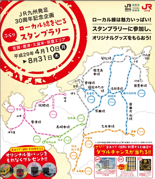 喜愛搭電車觀光的朋友們注意了!JR九州慶祝30週年推出地方鐵道巡禮『ぶらりスタンプラリー』,期間限定推出JR九州福岡+佐賀【普通‧快速列車】1日乘車券,價格為3000日圓,列車行駛地區去包含了佐賀、唐津、久留米、筑豐等區域,使用期限只有到今年8月31日,喜歡做鐵道漫遊的朋友可千萬不要錯過了。