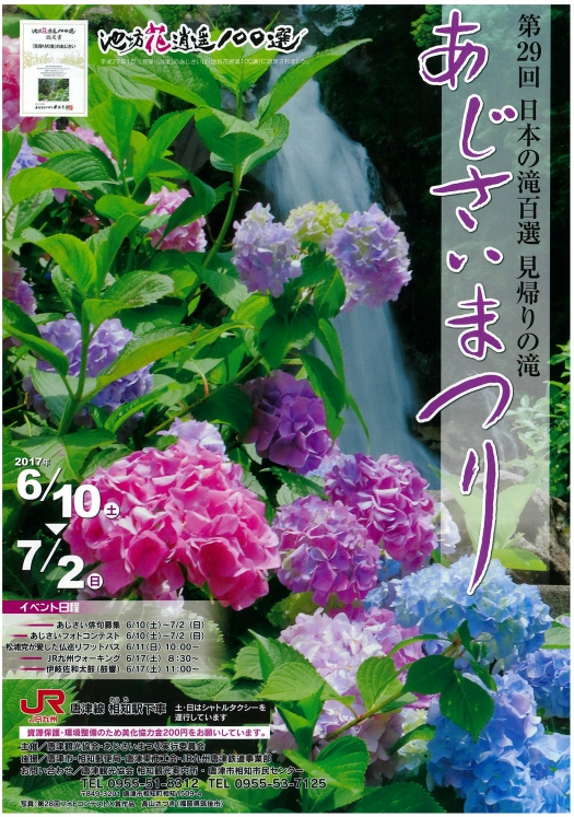 每年6月上旬到7月初這裡會舉辦「紫陽花祭(あじさいまつり)」,今年已經是第29回舉辦,這裡的紫陽花有40個品種、約4萬株之多,在盛開時節一球一球藍色、粉色和紫色相間的紫陽花搭配上瀑布的景色讓人驚艷,也讓前來的旅客忍不住多拍幾張照片,這個美景也被選為日本「池坊花逍遙百選」之一。在祭典期間每逢週六、週日都有提供接駁巴士的服務,前來的朋友可多加利用。