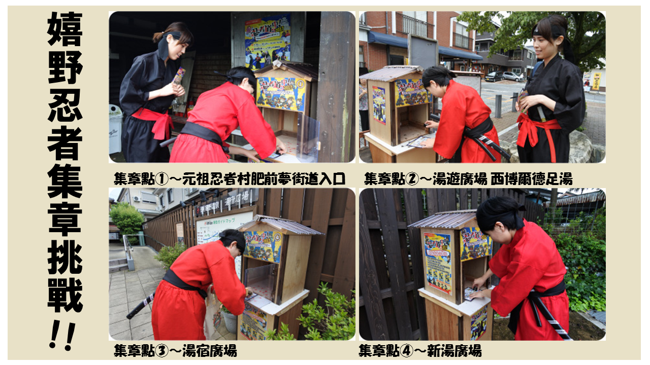 集章點共有4個,尋找的過程中,不僅可以體驗溫泉街上知名的西博爾德足湯、湯宿廣場的足蒸湯、眺望嬉野溫泉公眾浴湯,在指定商店消費,還可以獲得特製忍者貼紙或卡片等限量小禮物!一邊玩一邊品嘗嬉野溫泉街的美食、享受溫泉設施,集滿4個章後再回到肥前夢街道就能兌換任務贈品囉!