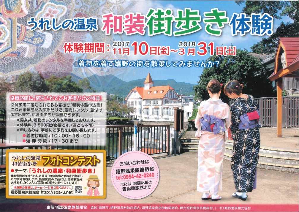 冷冷的冬天最適合泡溫泉~佐賀擁有3大溫泉鄉,其中嬉野溫泉開湯已有1300年,咕溜咕溜的泉質是Lady SAGA最愛的美人湯!到2018/3/31前遊嬉野溫泉可以輕鬆租借和服,漫步溫泉街還能在14家店家享受優惠或小禮物!