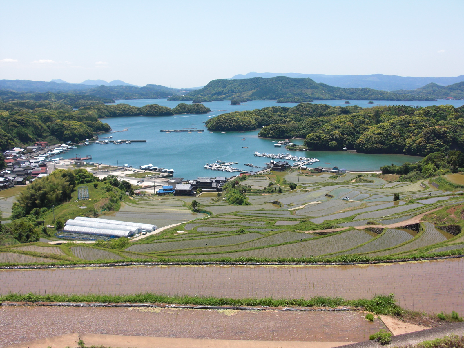 坐落於唐津市肥前町的大浦梯田,擁有連日本名僧「弘法大師」都驚艷不已的最強絕美背景「伊呂波群島」;最美的拍照角度便是和伊呂波島一起同框入鏡。